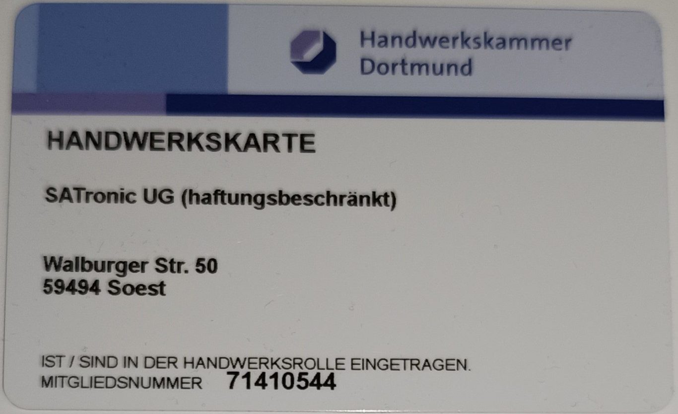 Die SATronic ist eingetragen in der Handwerksrolle, bei der zuständigen Handwerkskammer.